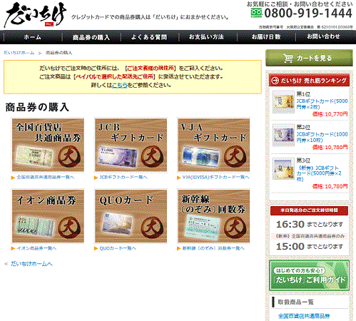 販売商品は全国百貨店共通商品券、信販系のJCBやVJA(旧VISA)のギフトカードなど販売してます。
